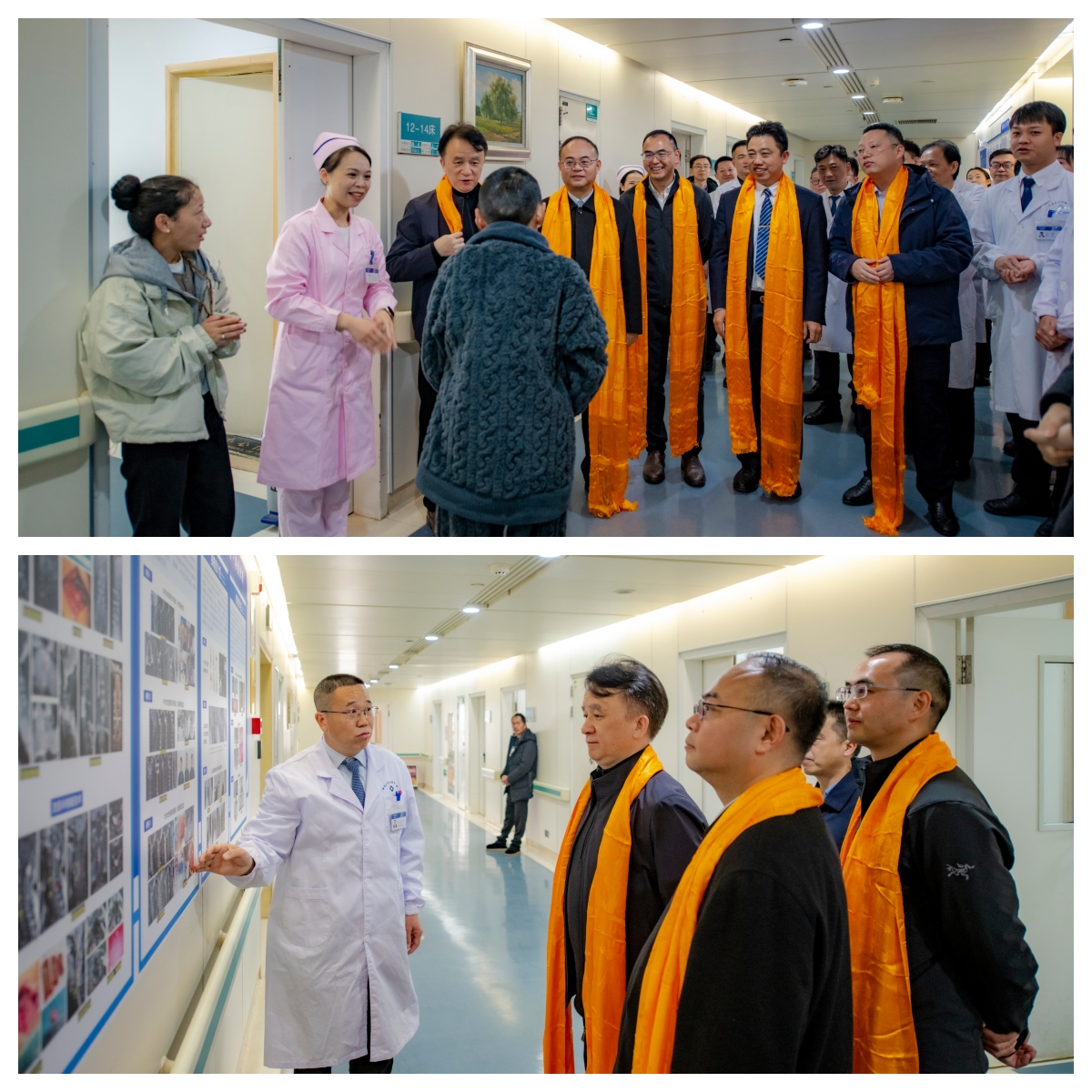 活动最后,邓幼文就科室在流程管理、人文关怀与团队建设方面的成果,向院领导作了现场汇报与介绍。一位即将出院的藏族重度脊柱侧后凸畸形患者向院领导敬献哈达,温馨场景生动体现了脊柱外科“医心为民”的服务理念与民族团结的深厚情谊。