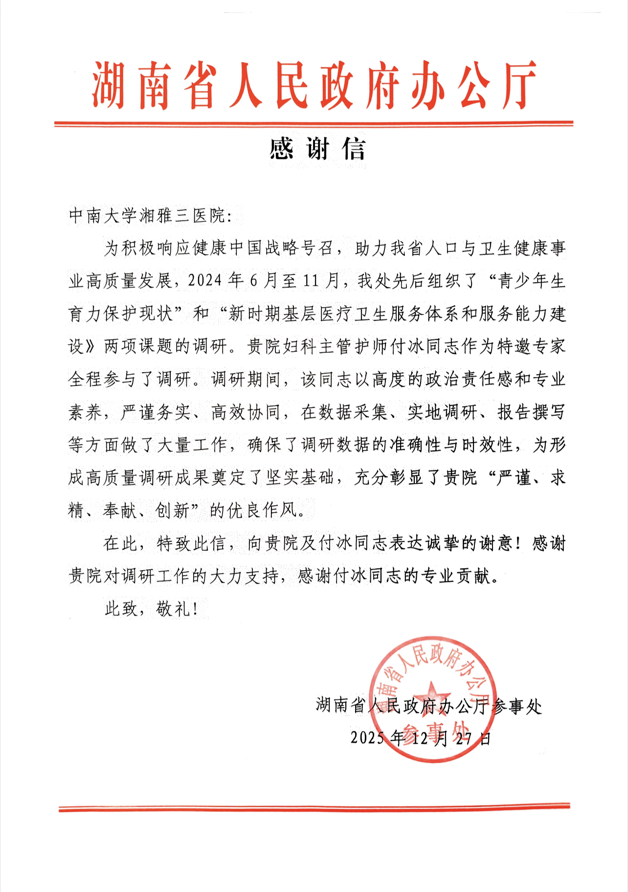 12月27日,湖南省人民政府办公厅向中南大学湘雅三医院发来感谢信,对中南大学湘雅三医院妇科主管护师付冰同志在参与全省卫生健康重点课题调研中作出的突出贡献表示诚挚感谢,并对湘雅三医院长期以来服务社会、支持政府工作的专业精神给予高度赞扬。