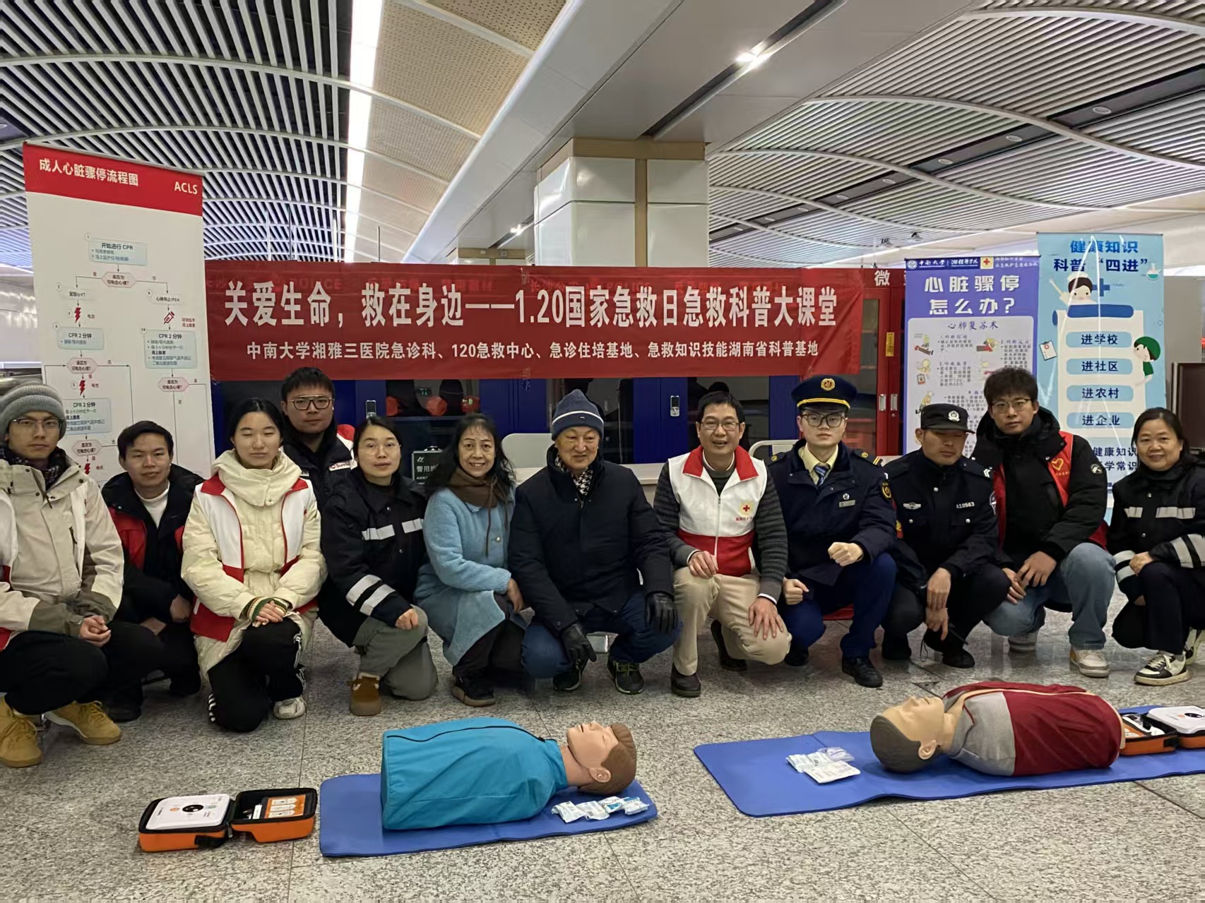 1月20日,为落实“健康中国”的战略目标,增强公众自救互救能力,中南大学湘雅三医院急诊医学科120急救中心在长沙地铁六号线湘雅三医院站开展急救技能科普公益活动。本次活动旨在响应中国医院协会急救中心(站)分会倡导的“120—国家急救日”活动号召,将地铁这一城市交通主动脉转化为普及急救知识的“流动课堂”,让市民在出行途中就能掌握“救在身边”的关键技能。