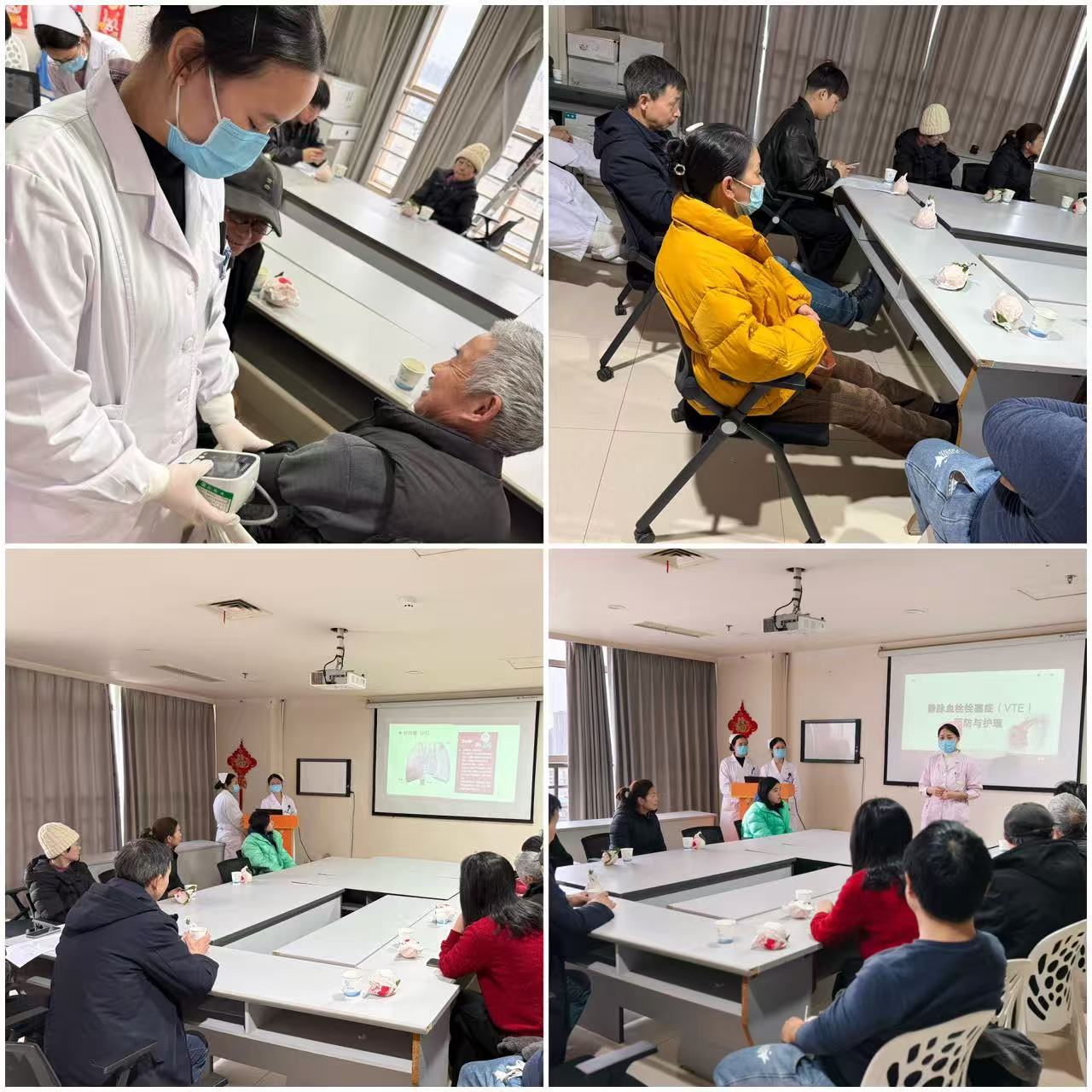 随后,科室总带教罗奕纯带领邵阳学院谢舒琴组实习同学,为在场病友及家属开展题为“新春佳节,别让静脉血栓‘栓’住健康”的专题科普讲座。主讲人结合患者群体常见特点,针对住院期间久卧、活动量减少等易诱发静脉血栓的情况,用通俗易懂的语言讲解预防知识,并现场演示一套简单易学的预防保健操。讲座内容贴合患者实际需求,现场互动频繁、反响良好。同时,为进一步关注病友健康状况,护理团队在现场设立义诊服务台。科室护士带领护理实习生为病友提供免费血压、血糖测量服务,针对部分异常检测结果,耐心给予健康指导和注意事项提醒,充分展现扎实的专业技能与严谨的服务态度。此次义诊不仅为患者提供了便利,也为护理实习生提供了宝贵的临床实践机会。