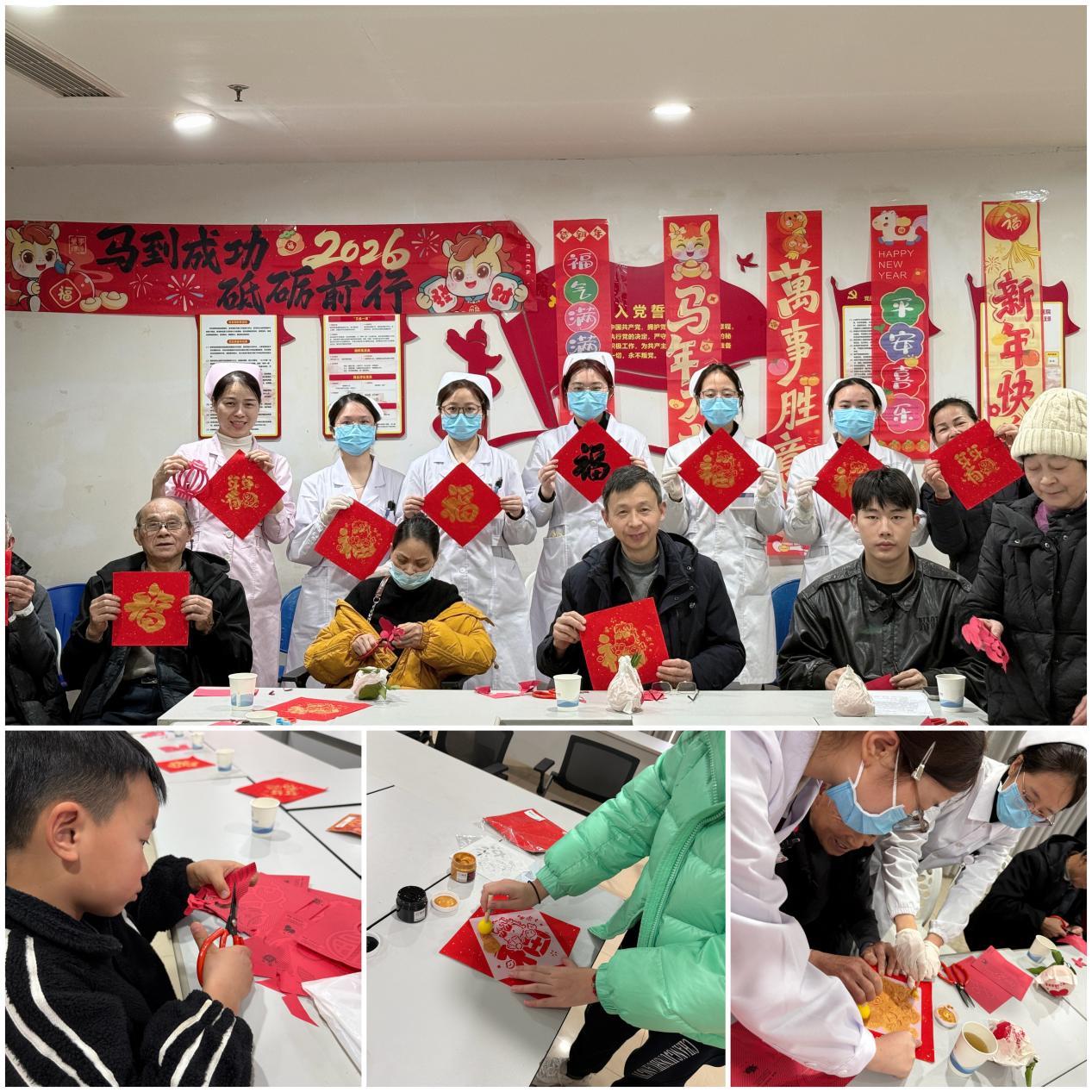 年俗体验环节进一步活跃了现场氛围。在医护人员与实习同学的协助下,病友们积极参与拓福字、剪窗花等传统民俗活动,一幅幅红火喜庆的福字、一张张精巧生动的窗花相继完成,现场欢声笑语不断,处处洋溢着喜庆祥和的新春氛围,让病友们在住院期间也能感受到浓浓的年味儿。