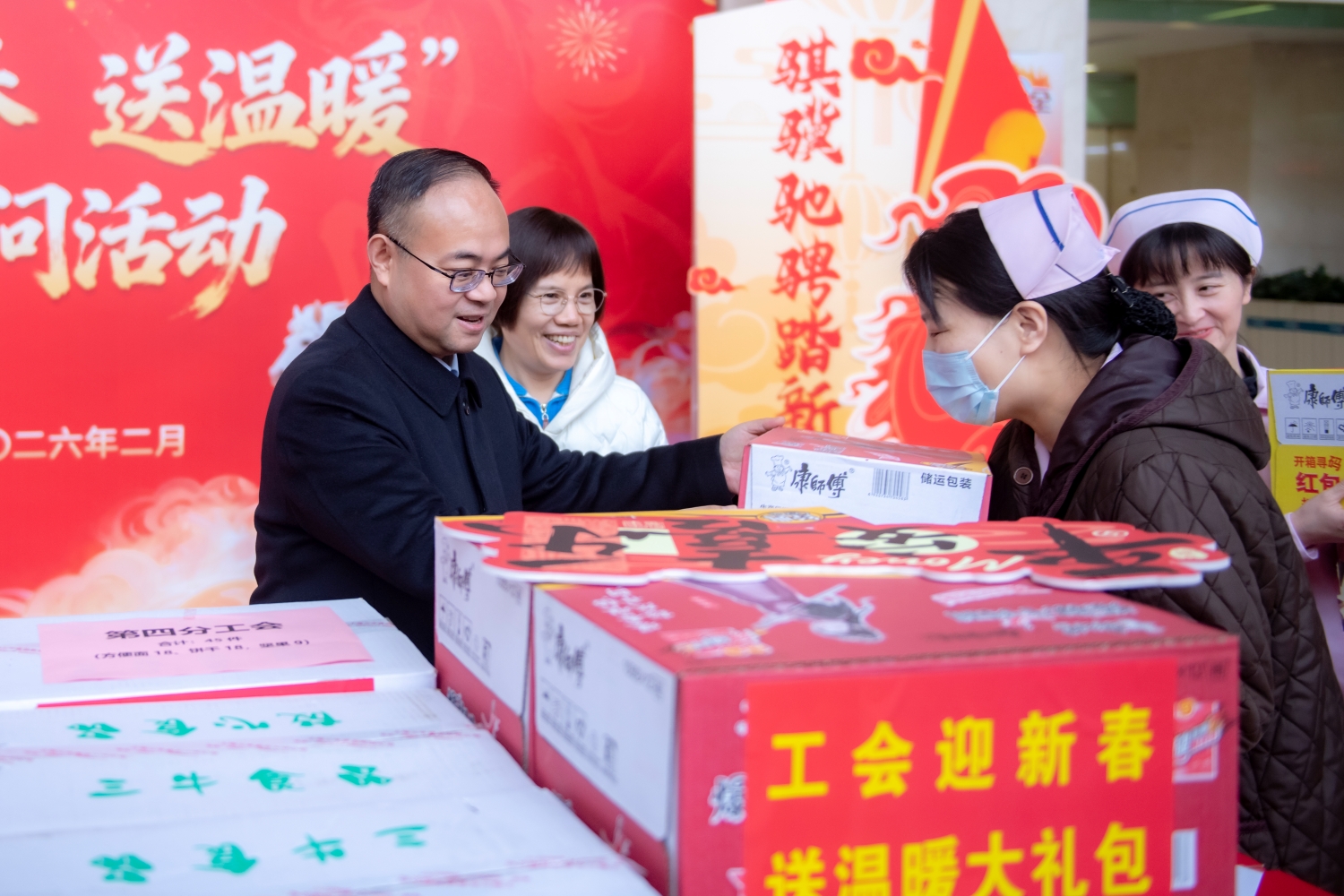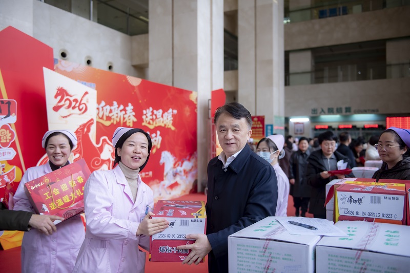 岁暮冬寒,年味渐浓,马年新春的脚步悄然临近。为让全院职工真切感受到医院大家庭的温暖与牵挂,把新春的美好祝福和贴心关怀送到每一位职工心坎上,2月12日上午,中南大学湘雅三医院在外科楼一楼大厅温情开展“迎新春 送温暖”慰问活动,以浓浓关怀凝聚奋进力量,共迎新春、同赴新程。医院党委书记何庆南,院长江泓,党委副书记、工会主席杨飞龙出席活动,医院党委办公室、院长办公室、院工会相关负责人,各分工会主席、各工会小组长等120余人共同参与,活动由杨飞龙副书记主持。