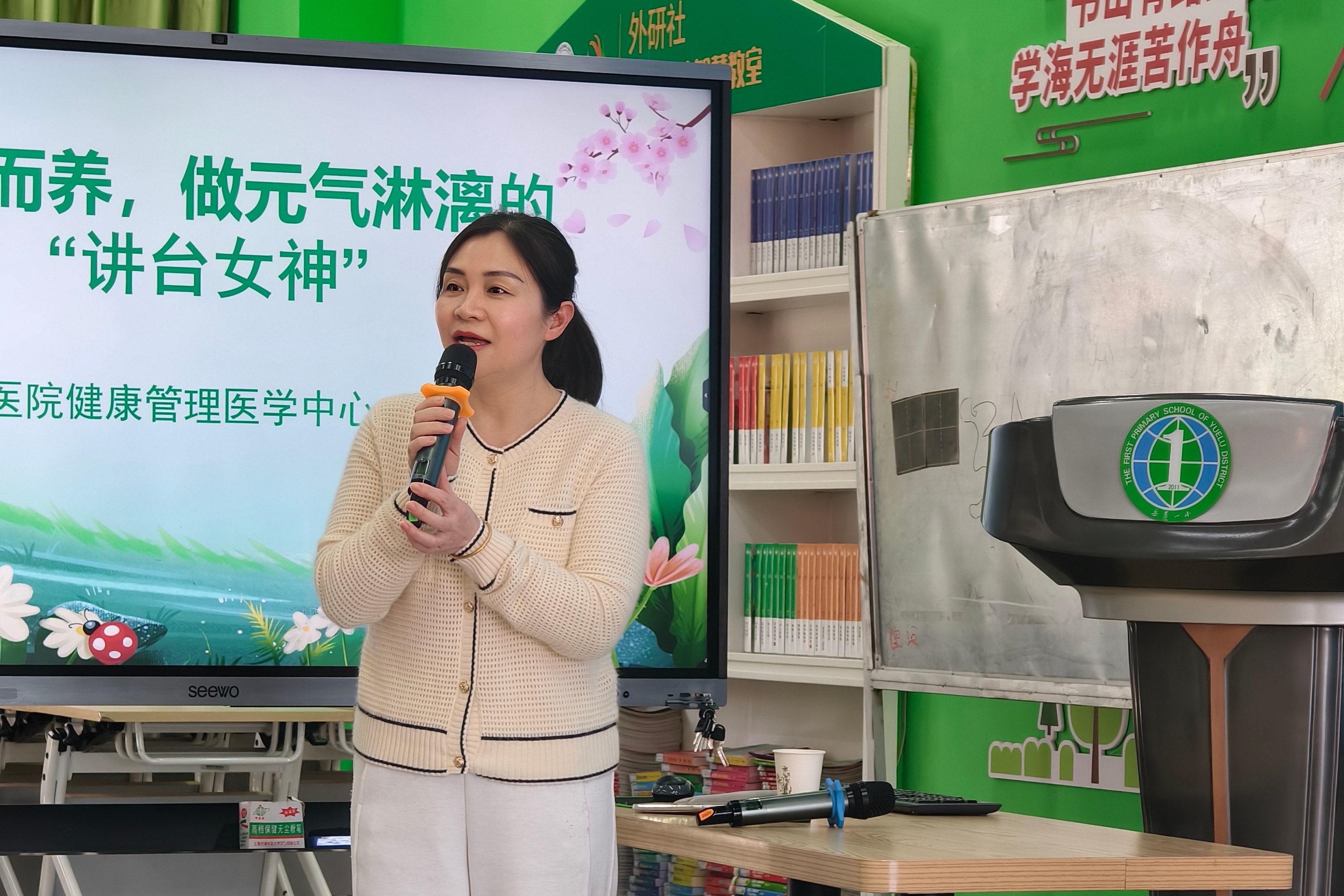 在岳麓区第一小学,健康管理医学中心龙飞艳主任护师带来“量身定制”的健康讲座《顺时而养,做元气淋漓的“讲台女神”》。她从女性高发的乳腺癌、宫颈癌切入,通俗讲解“两癌”筛查要点与科学预防,引导教师树立“防重于治,早筛早诊”的理念;针对长期授课引发的咽喉炎、久坐导致的颈椎病等职业常见问题,逐一剖析成因,给出适合职场场景的保健妙招;她还结合中医节气养生与春季养肝黄金期,分享实用的“养肝攻略”,助力大家顺应时节、科学调养。现场教师表示,讲座精准戳中其健康需求,内容实用,让她们受益良多。