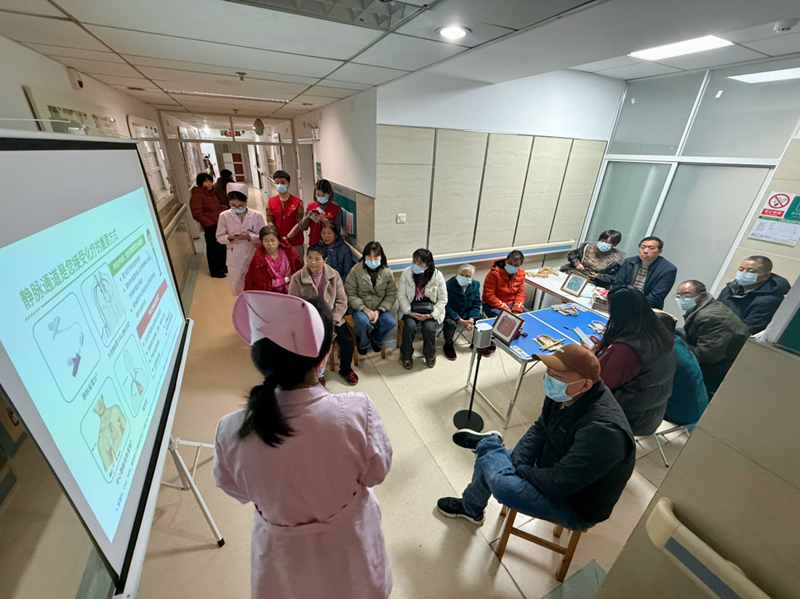 活动伊始,肿瘤科二病区主管护师杨青兰围绕《轻松应对化疗那些事》开展健康宣教。结合患者及家属在治疗过程中普遍关心的问题,杨青兰用通俗易懂的语言,对化疗相关知识进行了细致讲解。宣教内容涵盖哪些药物可能引起副反应、化疗常见不良反应的应对与处理、恶心呕吐及口腔溃疡、口腔炎等常见问题的护理措施,同时还重点介绍了哪些症状可能提示血常规等检查指标异常,提醒患者及家属在治疗期间增强观察意识,做到早发现、早报告、早处理。针对中老年患者药物不良反应风险相对较高的特点,杨青兰还结合实际情况进行了用药安全提醒,并围绕“如何科学看待化疗的利与弊”“化疗前如何科学饮食”等内容开展讲解,帮助患者及家属进一步加深对治疗的认识,提升自我护理能力与治疗配合度。