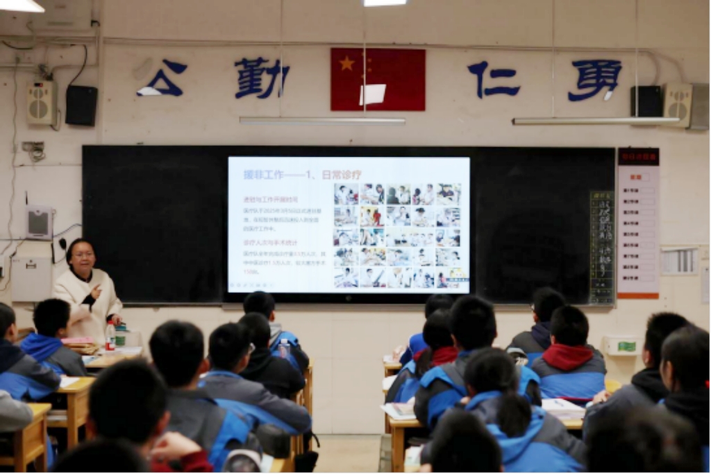 课堂上,潘医生结合精心制作的课件,从初识塞拉利昂、当地生活与风光、援非工作、中塞友谊与感悟四个方面,全面讲述非洲见闻与援非历程。她介绍了塞拉利昂的风土人情,重点分享了中塞友好与中国援塞拉利昂医疗工作:当地医疗条件艰苦、资源紧缺,我们的援非医疗团队坚守岗位,开展日常诊疗、健康宣教与义诊,推广中医适宜技术、培养当地医疗人才;同时积极开展医疗外交,参与国际合作、承办学术交流、举办各类公益活动,用实际行动诠释医者担当。除此之外,她还和孩子们分享了在塞拉利昂的生活点滴,让大家直观感受到不一样的异国风貌与生活态度,更懂得珍惜当下、心怀大爱。