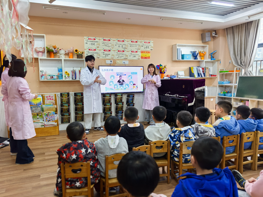 活动现场,手术中心党支部书记苏红辉,手术中心党支部纪检委员张璐,第八团支部书记陈欢、副书记邓泽凡、副书记谢芬以“洗手小卫士,健康我做主”为核心,围绕“为什么洗手、什么时候洗手、七步洗手法儿歌”,为孩子们带来趣味宣教。陈欢结合幼儿认知特点,通过科普动画片、趣味 PPT,直观讲解洗手的重要性,让孩子们明白勤洗手能抵御细菌、守护健康,孩子们听得聚精会神。