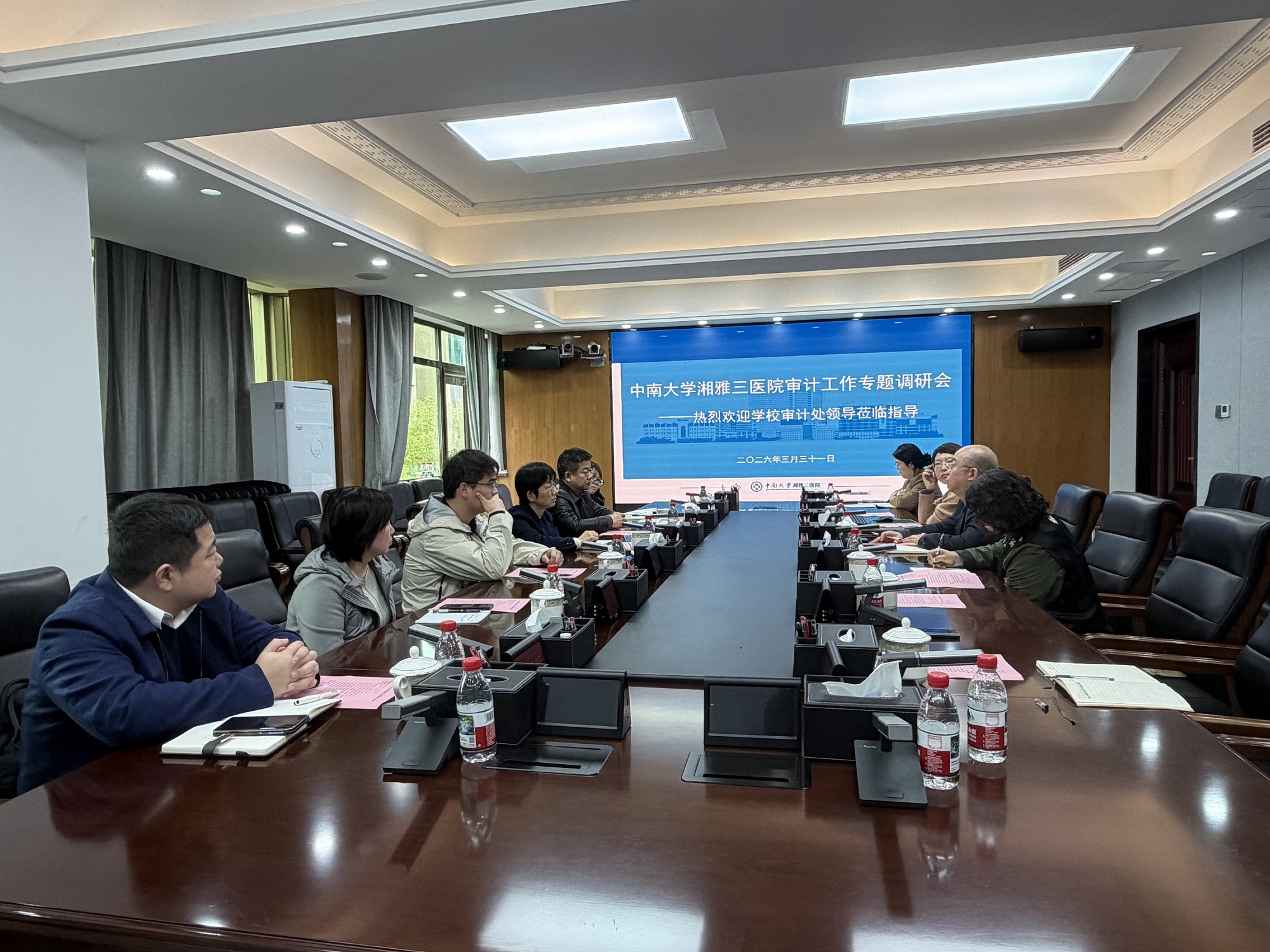 为加强校院协同,提升内部审计工作效能,3月31日下午,中南大学审计处处长刘芳率队莅临湘雅三医院,就审计工作开展专题调研与指导。审计处副处长王敏及相关科室负责人一同到访。医院党委副书记、纪委书记张劲强及审计办公室相关负责人陪同调研。