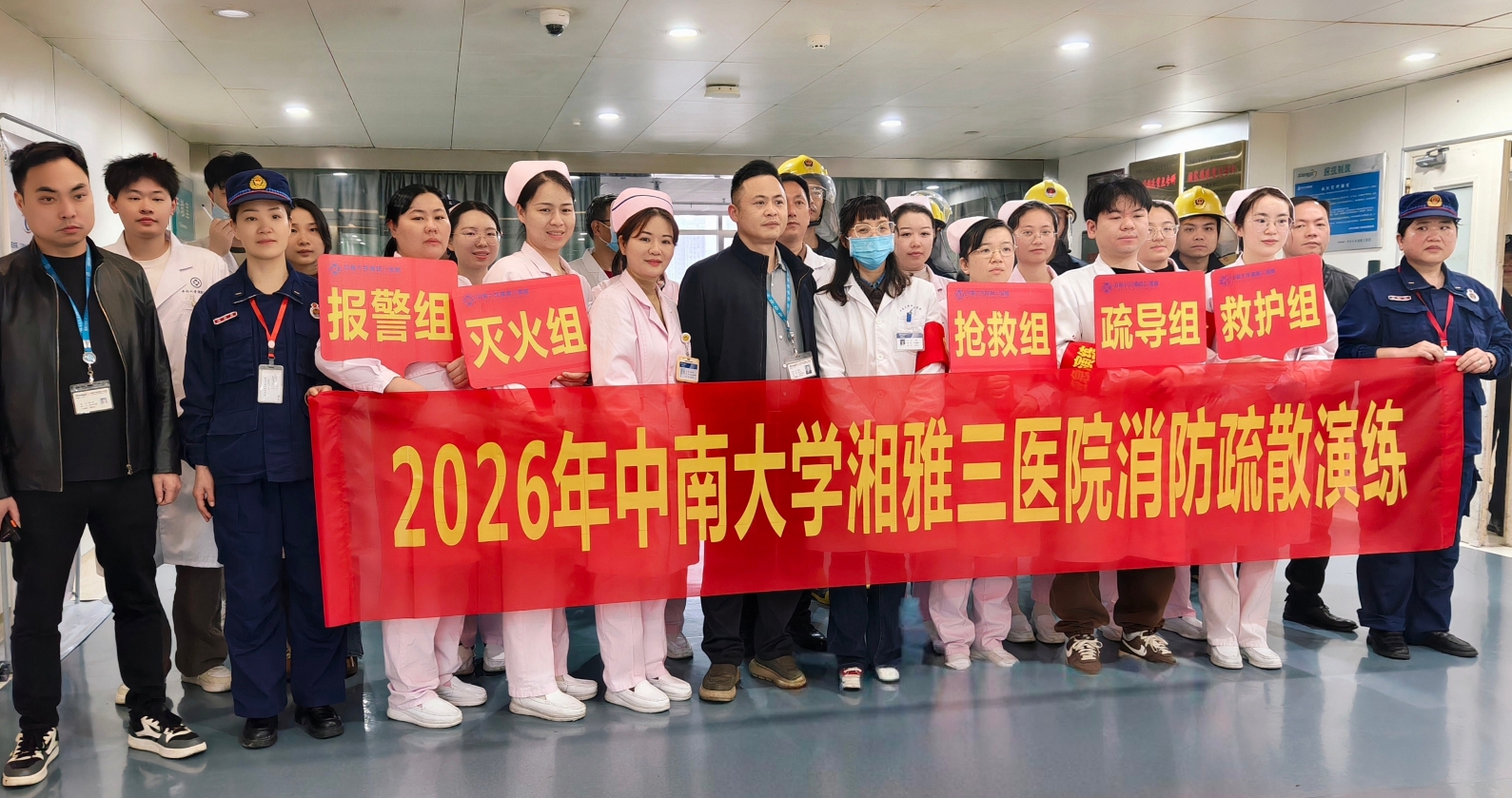 为进一步增强科室医护人员的消防安全意识,提高应对突发火灾事件的应急处置能力,切实保障患者及职工的生命财产安全,2026年4月2日上午,湘雅三医院疼痛科&眼科综合病区联合医院安全保卫部组织开展了消防应急演练。科室全体医护人员、安保人员及楼层管理员共同参与。