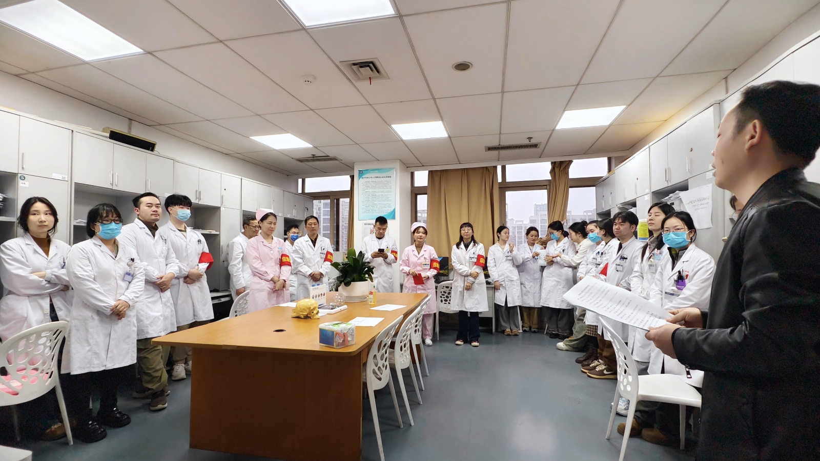 演练结束后,安全保卫部副主任彭峰对演练过程进行了现场点评。他首先对疼痛科&眼科综合病区全体参与人员的表现给予了高度评价,充分肯定了大家在演练中展现出的专业素养和应急能力。他指出,从火情警报响起到人员疏散完毕,整个流程衔接紧密、分工明确、反应迅速,特别是在疏散引导环节,医护人员能够沉着冷静地组织患者及家属有序撤离,并重点关注行动不便的患者,充分体现了“生命至上、患者第一”的原则。