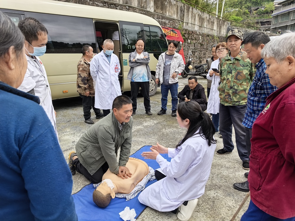 团队在山枣卫生院进行了健康大义诊活动。来自全科医学科、急诊科、重症医学科、肿瘤科、烧伤整形外科和儿科等多个专业的专家耐心接待每一位前来咨询的村民,他们详细询问病史,认真体查,还免费为村民测量血压、血糖,并根据检查结果提供科学合理的诊疗建议与用药指导。同时,团队还为有需要的村民开展免费心电图检查,助力筛查潜在的心血管疾病风险。此外,现场还组织了“第一目击者”培训暨健康科普活动,手把手向当地群众传授心肺复苏等急救知识与技能,提升村民在突发状况下的自救互救能力。活动现场气氛热烈,深受村民欢迎。