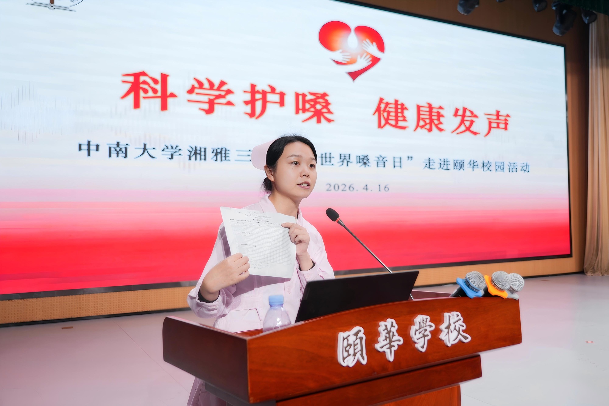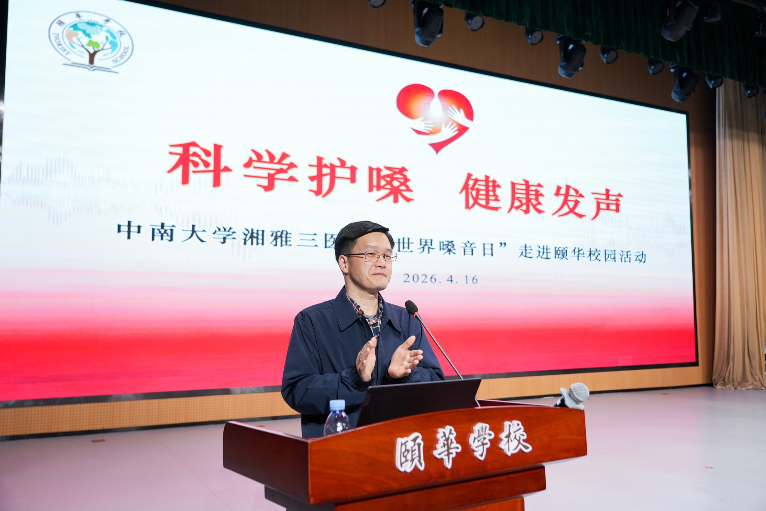 2026年4月16日是一年一度的“世界嗓音日”,中南大学湘雅三医院脊柱外科康复科党支部副书记邹密、康复医学科主治医师侯巧、康复医学科主管技师彭静与耳鼻咽喉头颈外科主管护师陈婷,走进革命老区、脱贫县湖南省岳阳市平江县颐华学校,开展以“守护教师金嗓子,赋能教育新征程”为主题的科普讲座,活动聚焦教师高强度用嗓导致的职业健康问题,通过精准科普助力教育一线,以实际行动把优质医疗服务送到一线教师身边。