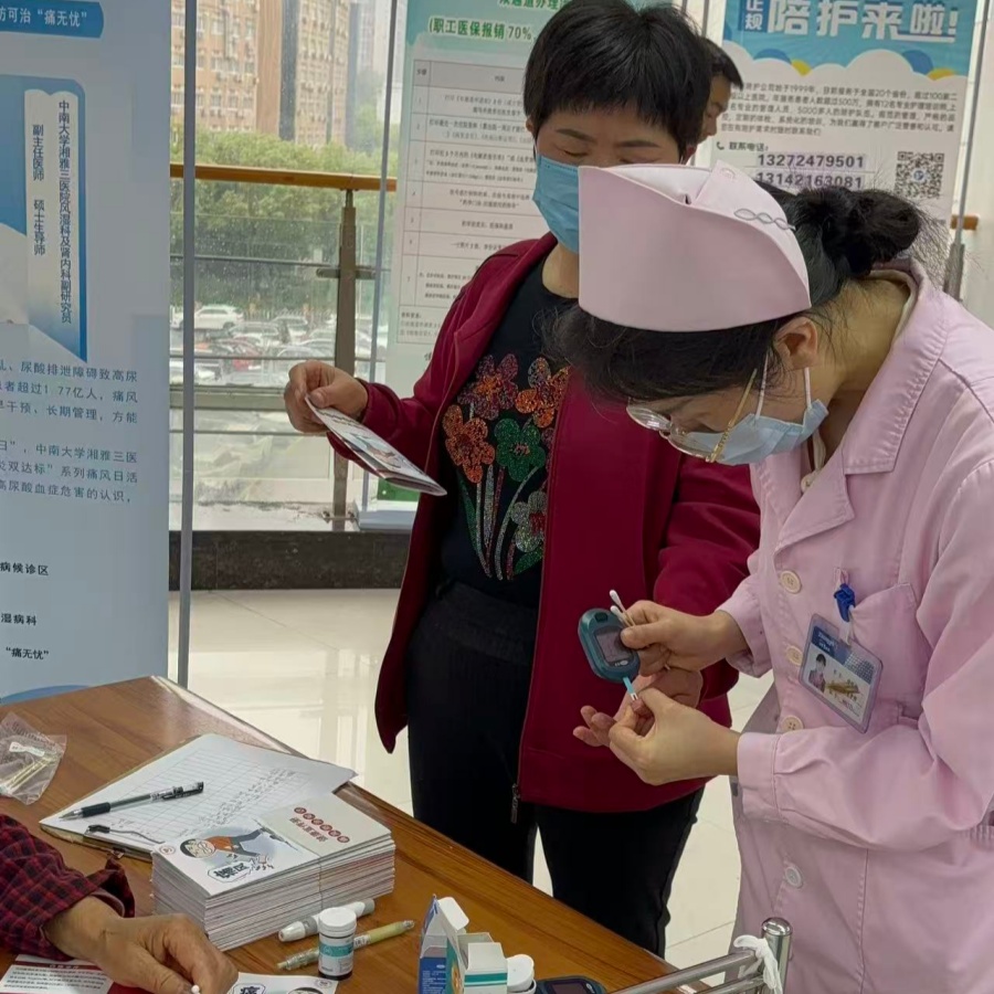 除了专业问诊,医护人员还为大家提供免费血尿酸快速检测、免费血压测量服务,不用跑诊室、不用长时间等待,就能轻松了解自身健康状况,做到早知晓、早预防、早调理。在痛风日来临之际,“新湘雅健康在线”直播室里主任医师桂明进行了关于痛风相关知识的科普直播。肾病风湿病科住院部,分别由副主任医师唐又周、主管护师周钰琼带来了两场生动的相关知识讲座科普,现场还准备了通俗易懂的痛风防治科普手册,把专业的健康知识变成大家看得懂、记得住的内容,将健康理念实实在在送到每个人身边。
