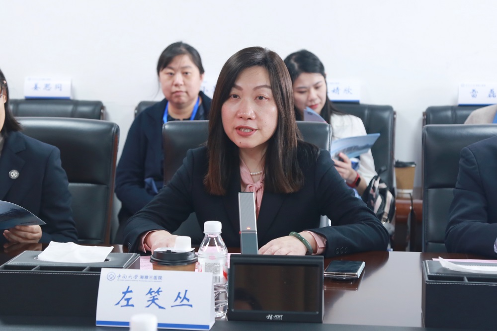 左笑丛副院长在外科楼19楼会议室亲切会见来宾,代表医院对嘉宾团到访表示热烈欢迎,并从整体概况、学科品牌、科研创新与国际交流等方面介绍医院情况。医院连续七年获评国家三级公立医院绩效考核 A+,拥有移植医学、微创医学、健康管理三大技术品牌、24个国家临床重点专科(含培育),牵头建设国家妇产区域医疗中心,是全球首个异种移植临床研究规范《长沙宣言》诞生地,科研成果刊发于Science、临床研究通过AAHRPP国际认证,综合实力获中外嘉来宾高度认可。左笑丛副院长表示,青年医学同仁是全球卫生健康事业的未来与希望,期待以本次参访为契机,双方互学互鉴、共享前沿经验、共探创新路径,共同提升精准诊疗与临床服务水平,为中美两国人民健康福祉贡献青年力量。