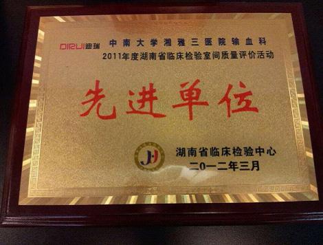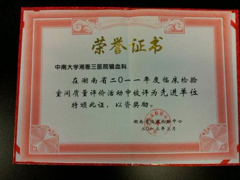 输血科从开科以来,就非常重视质量管理,在卫生部、省临检中心组织的室间质评工作中年年取得优秀,这次获得先进单位的表彰是相关部门对湘雅三医院输血科实验室质控工作的肯定。