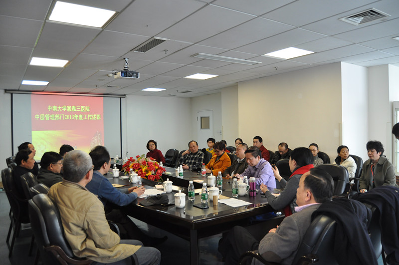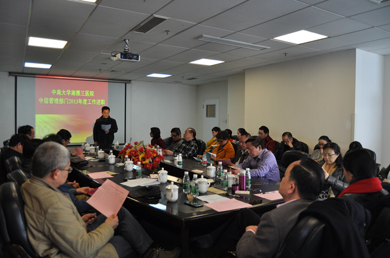 1月2日下午,湘雅三医院2013年度中层管理部门工作考核测评在外科楼19楼会议室拉开帷幕,40名中层管理部门负责人根据年初制定的目标责任制,对2013年度部门工作作了精彩的述职。