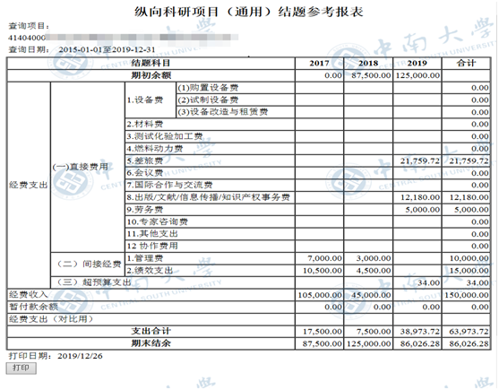(2)《纵向科研项目(通用)结题参考报表》通过财务平台查询系统打印,一式一份。
