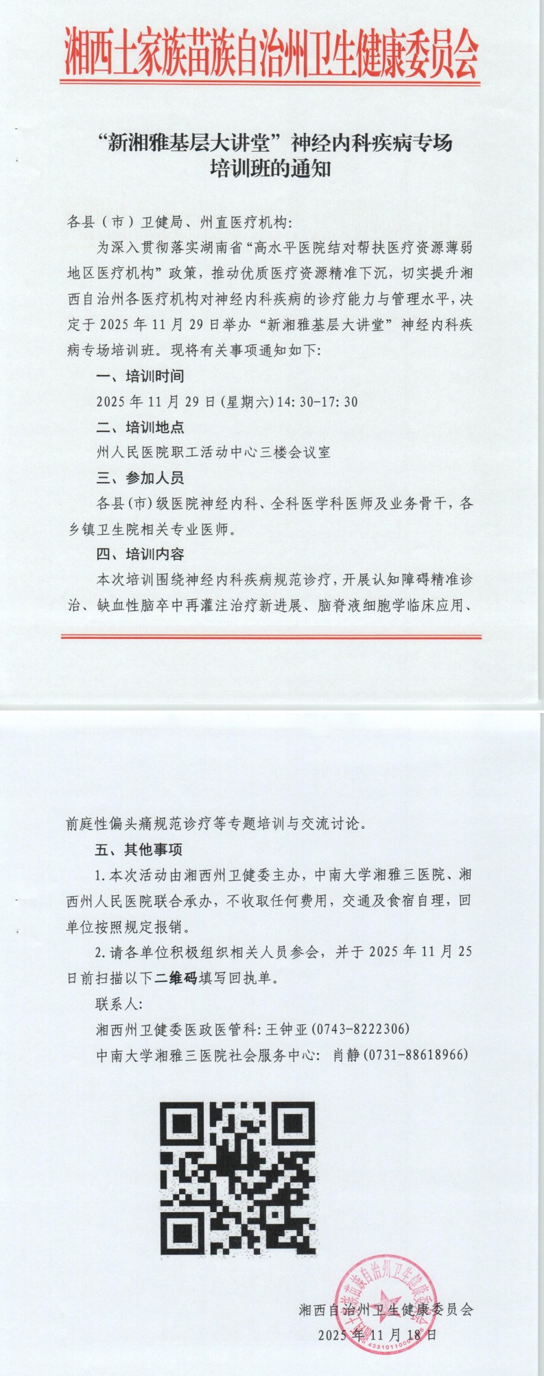 “新湘雅基层大讲堂”神经内科疾病专场培训班的通知