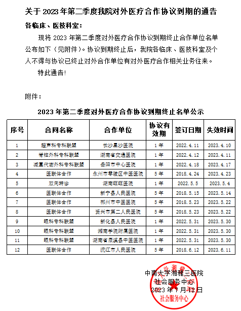 关于2023年第二季度我院对外医疗合作协议到期的通告