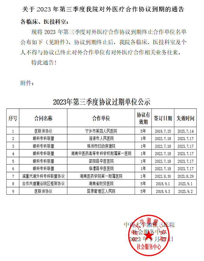 关于2023年第三季度我院对外医疗合作协议到期的通告