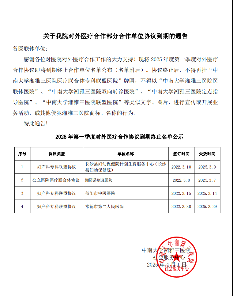 关于2025年第一季度我院对外医疗合作协议到期的通告