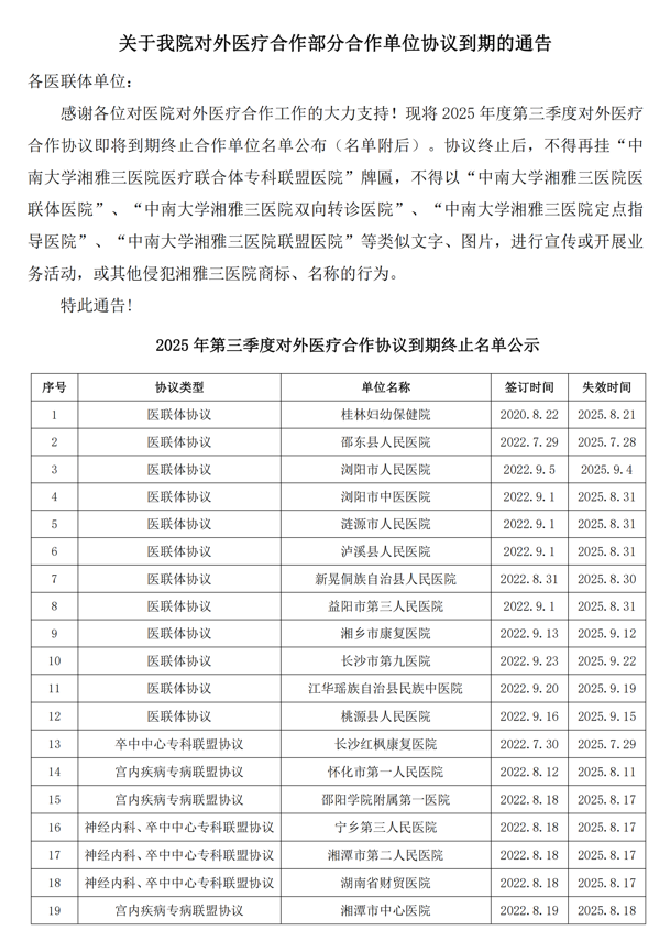 关于2025年第三季度我院对外医疗合作协议到期的通告