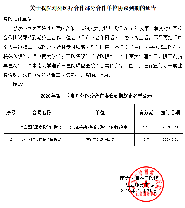 关于2026年第一季度我院对外医疗合作协议到期的通告