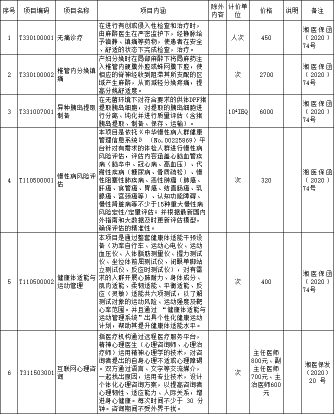 根据湖南省医疗保障局《关于部分新增特需医疗服务项目备案管理的批复》(湘医保函〔2020〕74号),湖南省医疗保障局、湖南省卫生健康委员会《关于公布我省第一批“互联网+”医疗服务试行项目的通知》(湘医保发〔2020〕20 号 )文件规定,经备案我院开展以下特需医疗服务价格项目: