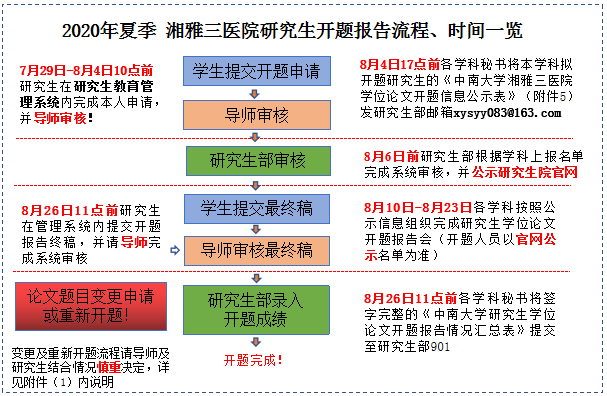 学位论文开题报告是学位论文工作的重要环节,是保证学位论文质量、顺利进行学位论文工作的重要基础。根据《中南大学研究生学位论文开题管理办法(中大研究生院字[2017]6号)》,以及新修订的《中南大学研究生培养环节工作管理办法》(中大研字[2019]57号)文件,湘雅三医院拟于7月29日至8月26日期间开展2020夏季研究生开题工作。本次开题总体流程及时间安排如下: