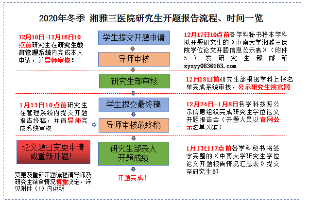 学位论文开题报告是学位论文工作的重要环节,是保证学位论文质量、顺利进行学位论文工作的重要基础。根据《中南大学研究生学位论文开题管理办法(中大研究生院字[2017]6号)》,以及新修订的《中南大学研究生培养环节工作管理办法》(中大研字[2019]57号)文件,湘雅三医院拟于12月10日至1月13日期间开展2020冬季研究生开题工作。本次安排如下: