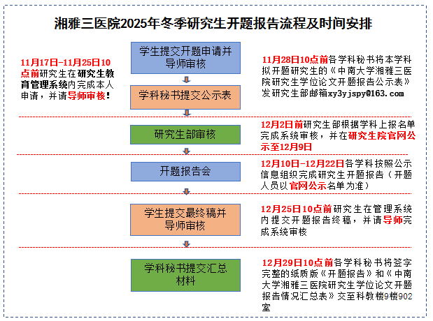 6.开题报告要求公开进行。请各学科秘书在11月28日10:00前将本学科拟开题研究生的《中南大学湘雅三医院研究生开题报告公示表》(请勿交由学生处理)发送至研究生部邮箱xy3yjspy@163.com。开题报告会前一周,研究生部将按照各学科上报的《中南大学湘雅三医院研究生开题报告公示表》和研究生系统内申请情况进行审核,并报研究生院官网公示。(学科未上报、系统内未申请者或信息填报错误均无法审核公示,未经公示的开题均视为无效开题)